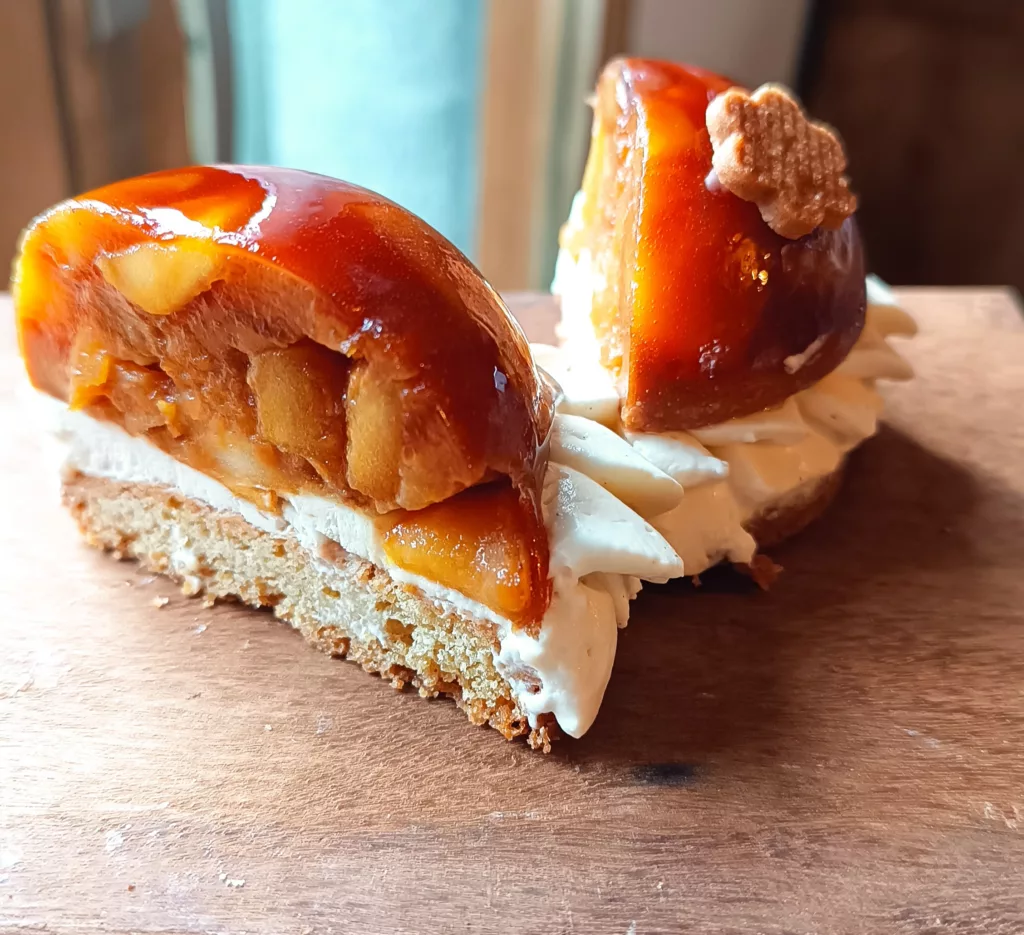 Sablé breton, mousse vanille, dulce de leche désucré, éclats de cacahuètes, flocage chocolat