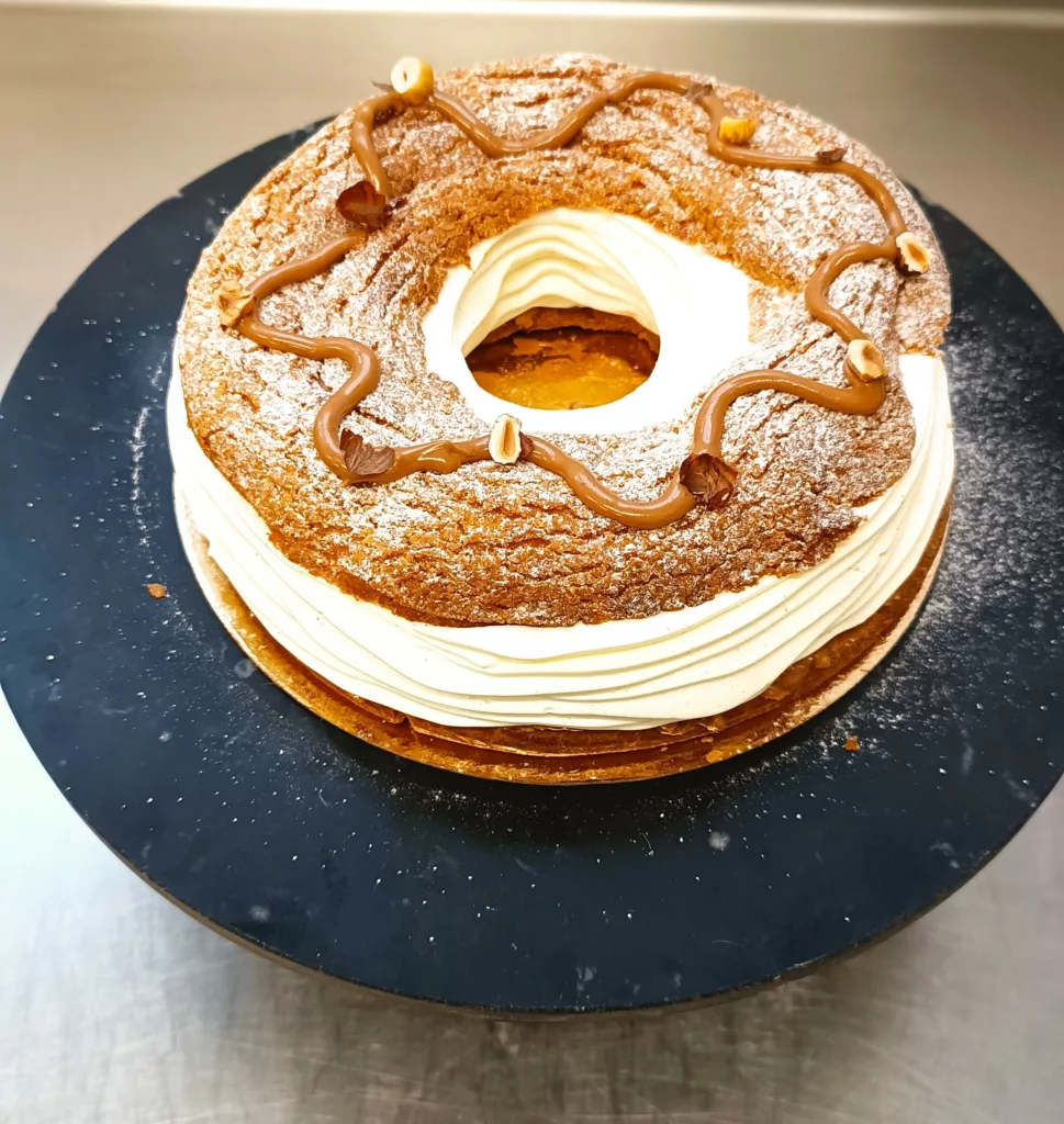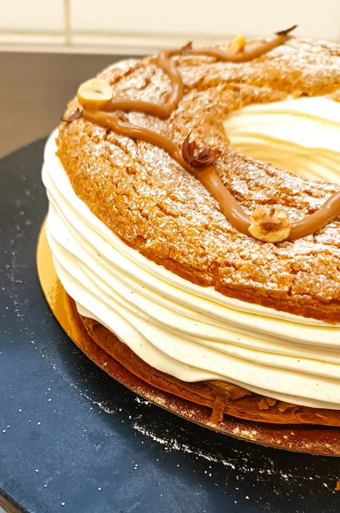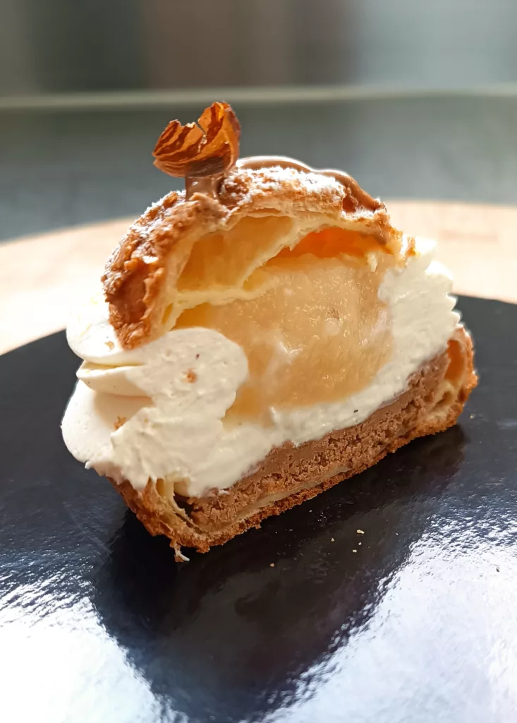 Pâte à choux et craquelin, croustillant amande-noisette, mousse vanille, gel poire